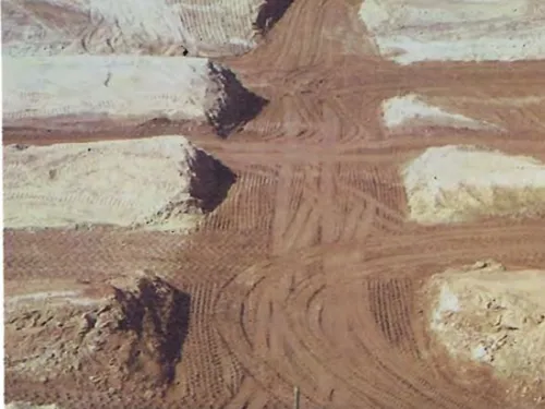 The original foundation investigation consisted of 10 vertical holes with minimal water losses in all but one indicating low permeability gypsiferous bedrock, below 10 feet of weathered bedrock. A permeable sandstone unit located in the left abutment was also identified. Based on the results of the foundation investigation a 30 foot wide cutoff with an average depth of 10 feet through weathered rock was included in the design. The design called for one foot of Zone II material to be placed on the bottom of the cutoff trench. Grouting in the sandstone section was also included as part of the design. Aside from brooming and air cleaning, no other treatment of the rock foundation was specified. During construction, because the rock foundation consisted of elongated ridges and valleys oriented perpendicular to the axis of the dam, it was decided to level the foundation using Zone I material. In some instances depth of Zone I material was more than 10 feet and extended from the upstream toe to the downstream toe resulting in a perched zoned embankment dam.