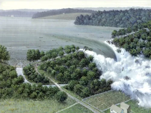 However, that future darkened in late May 1889. A torrential overnight rainstorm on May 30-31, estimated to be a 2 percent annual probability event, dumped 6 to 7 inches in the Lake Conemaugh area. By morning on the 31st, the lake level was rising 9 to 10 inches per hour, and those readying the South Fork Fishing and Hunting Club for the summer season knew right away that the South Fork Dam was in trouble. Attempts were made to alert the roughly 30,000 residents of the Little Conemaugh valley to the danger, but most – jaded by the “boy who cried wolf” nature of these rumors – ignored them. Eventually, the lake overtopped the dam and caused an initial breach due to headcut migration. The dam then suffered a final, far more catastrophic breach, most likely due to sliding.