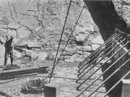 Charles Paul also offered guidance on properly excavating bedrock for a dam foundation. He wrote that “all loose or soft rock should be carefully cleaned off and removed.” Paul quickly stipulated that rock susceptible to decomposition upon exposure should first be excavated only to within a few inches of the dam foundation’s intended limits and that the remaining material could be removed just before concrete placement. However, the crews at the St. Francis Dam did not follow this guidance. In addition to the ill-considered mica schist tunnel, construction photographs show work on the dam’s foundation proceeding without proper clearing of talus and loose rock from the hillsides before pouring concrete [2, 3].