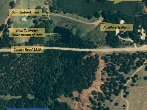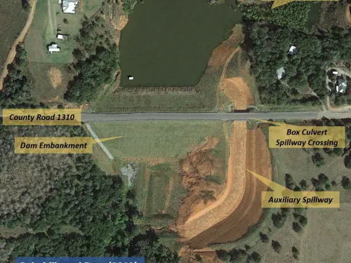 Beginning in 2011, the dam underwent a major rehabilitation which consisted of relocating the dam embankment downstream from its previous location, rerouting County Road 1310 over the top of the dam and constructing a new principal spillway. The project also included construction of a new auxiliary spillway on a modified alignment at the left abutment. The auxiliary spillway crest elevation was raised by 3.8 feet and a box culvert was incorporated into the design to allow County Road 1310 to traverse the spillway channel. Rehabilitation of the dam is estimated to provide $13 million in flood-reduction benefits over an anticipated 100-year life of the structure (NRCS, 2009).