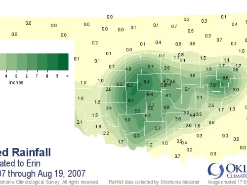 On Saturday, August 18, 2007, tropical depression Erin swept across Oklahoma. Many parts of central Oklahoma received record precipitation with totals from the storm exceeding 13 inches in some areas. In the drainage area above Sugar Creek Dam, it is estimated that 8.3 inches of rain fell in about six hours (corresponding to a storm less frequent than the 10-2 annual exceedance probability storm or a flood that is larger magnitude than a 100-year return period event). This caused activation of the auxiliary spillway with a maximum flow depth estimated between 2.6 and 3.6 feet. Debris plugging the culvert under County Road 1310 resulted in even higher tailwater than usual. Consequently, the auxiliary spillway outlet and downstream slope of the dam embankment were saturated, thereby decreasing the stability and erosion resistance of these soils. When the road overtopped and washed out at approximately 8:15 AM on Sunday, August 19, tailwater levels receded rapidly exposing the saturated soils of the spillway and embankment toe to increased velocities from the spillway outflows.