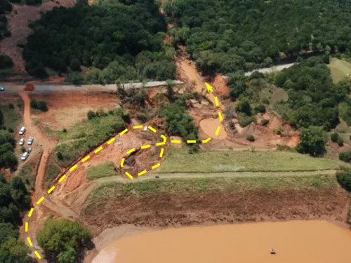 - Excavating a “notch” through the embankment as the reservoir level decreased to reduce storage and reduce downstream consequences in the event of a flood or uncontrolled dam breach.