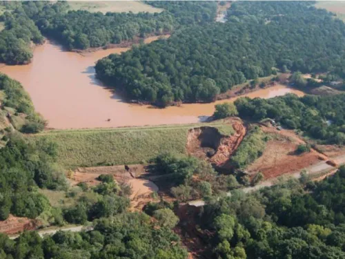 All these changes were probably made to facilitate construction of the spillway but are also likely contributors to the problems at the dam during the 2007 flood. In fact, the 95-foot shift in spillway location resulted in the placement of the right training dike almost directly over “a near vertical outcrop of the sandstone” which, when exposed, directed high velocity flows at the dam embankment (Anderson & Bass, 2008). If constructed as initially designed, it is likely that the spillway would have been at least partially excavated into the underlying sandstone foundation, which would have provided much greater protection against erosion. This type of modification to save cost or improve constructability during either design or construction of an auxiliary spillway was relatively common in the early days of flood control dam design. Generally speaking, it reflects the lack of understanding that early designers of these types of spillways had regarding the potential for scour and erosion during flood events. This also emphasizes that modifications to design during construction should be assessed and understood to ensure they will not unintentionally hinder safe operation and performance of a dam and its appurtenances.