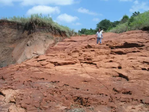 Flows from the auxiliary spillway were discharged beyond the toe of the earth embankment but were redirected towards the dam after encountering the remaining embankment of County Road 1310. While the exact progression of the incident is unknown, flows eventually caused erosion and headcutting of the majority of the spillway exit channel as well as failure of the right spillway dike which protected the dam embankment from spillway flows. The silty sands that the auxiliary spillway had been excavated into eroded easily to the underlying sandstone bedrock, concentrating flows in the right or inside edge of the spillway. This bedrock was erosion resistant, but also sloped steeply towards the dam embankment which further accelerated erosion of the dam.