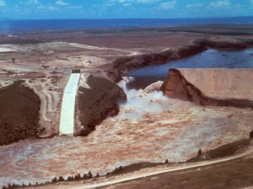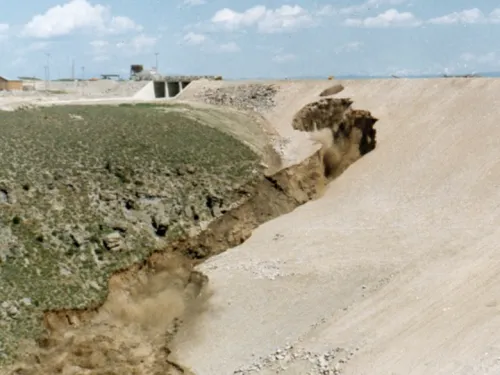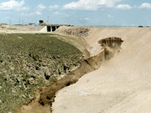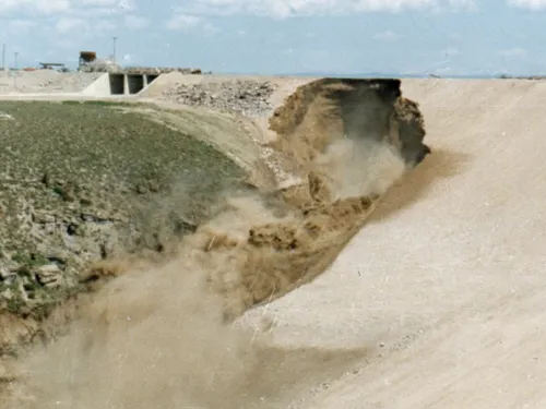 On June 3, 1976, two small seeps were observed at the downstream toe of the dam which released clear seepage and measured less than ¼ cfs. When the rest of the dam was inspected, however, no further evidence of seepage was noted. Only two days later, in the early morning hours of June 5, 1976, 20 to 30 cfs of clear seepage was observed exiting rock joints near the right abutment of Teton Dam. Shortly thereafter, the seepage became muddy and a sinkhole developed on the downstream slope of the embankment dam. Flow developed from the sinkhole and dozers were sent in an unsuccessful attempt to fill the resulting eroded area with riprap. Flow through the open void that developed by scour (a piping mechanism) continued to increase and the embankment eventually breached at the dam crest around 11:55 a.m. (only several hours after the first sign of muddy seepage). The resulting rapid release of the entire contents of the reservoir flooded five counties, inundated over 300 square miles, and traveled a distance of 155 miles downstream.