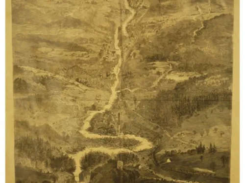 In 1864, the force of gravity pulling water through mill races powered sixty-four factories staffed by about 1,500 workers in the mill towns of Williamsburg, Skinnerville, Haydenville, Leeds, and Florence clustered on the banks of the river. These factories produced brass fittings, iron tools, buttons, silk, wool, cotton, and tobacco products and supported a populace of about 5,000.
