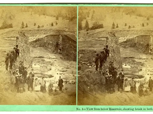 Back at the dam, Cheney’s wife, Elizabeth watched. About 20 minutes after George’s departure, she saw the eastern side of the dam finally fail as the slope, in Elizabeth’s words, “seemed to burst all at once, from the bottom, where the earth seemed to be lifted up.” The failure, again in Elizabeth’s words “made an awful noise, like an earthquake.” The sound of the breach was heard by many in the surrounding area as “louder than the biggest clap of thunder.”