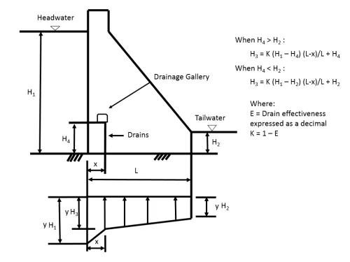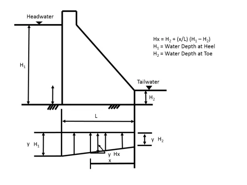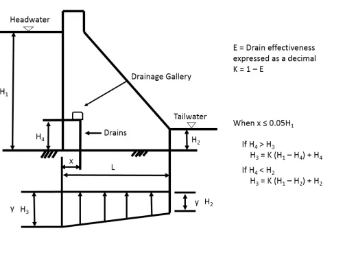 To address the potential for highly variable nature of foundation rock and concrete properties as well as construction quality within a given structure “the current design practice [for estimating uplift pressures in concrete gravity dams] relies heavily on simple empirical rules… [I]t is assumed that uplift pressure at the base of a dam without drains varies linearly from full reservoir pressure at the heel to tailwater at the toe. For dams with foundation drains, the pressure is assumed to follow a bi-linear tailwater plus some fraction of the difference between headwater and tailwater at the line of drains, to tailwater at the toe.” ¹