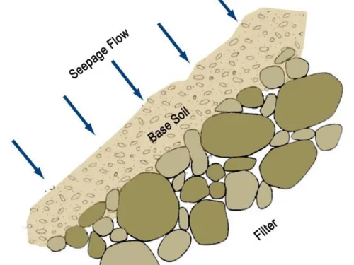 A 2-stage filter and drain system is the principal defensive design measure to protect against piping and internal erosion. One of the more commonly discussed failure mechanisms for embankment dams is backward erosion or piping. Backward erosion occurs when hydraulic gradients are sufficiently high to begin moving soil material near a seepage exit point. As soil is removed the gradient increases leading to continued erosion possibly at an increasing rate. This erosion may continue over time, eventually leading to a complete failure of the dam. Filter and drain zones are generally placed downstream of a fined-grained core in embankment dam design. Seepage water passing through the core encounters the filter and drain zones that relieve pore water pressure by providing a free draining exit while preventing movement of the core material into the filter and drain materials, the downstream shell or foundation materials.