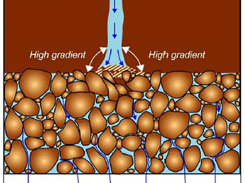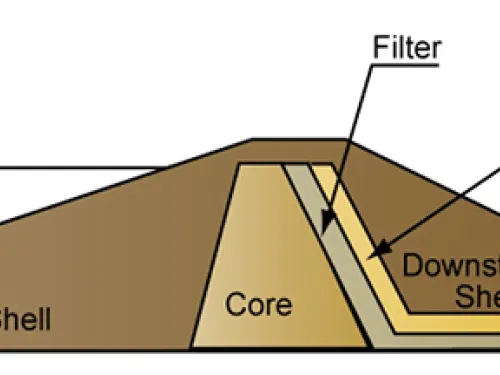 Even under the most ideal construction circumstances, embankment dams are prone to cracking due to settlement, soil stress relief (bridging), or seismic events. This cracking can create concentrated seepage that can lead to scour of the crack and continued erosion through the crack. Filters are designed to be self-healing and will not sustain a crack. Placed downstream of the core and any crack in the core, filters prevent eroded material from passing through them. As the finer-grained soil becomes trapped on the filter it creates what has been termed a “filter-cake”. This filter-cake prevents the continued erosion of fine-grained material, effectively sealing the crack.