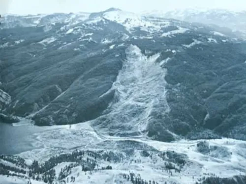 On June 23, 1925, a landslide occurred in southwest Wyoming with a volume of 50,000,000 cubic yards. It may have been triggered by snowmelt, heavy rains, or earthquake tremors in the area. The slide obstructed the Gross Ventre River creating Slide Lake. Over the next 23 months, the lake enlarged, and the dam failed on May 18, 1927, from overtopping. The flood killed six people in the town of Kelly, WY located four miles downstream.