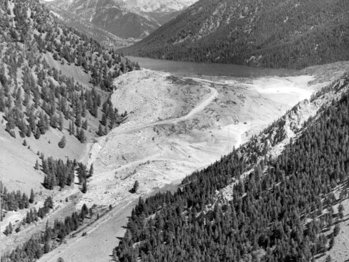On August 17, 1959, a 7.5M earthquake hit the Madison River area in southwest Montana. A landslide weighing 80 million tons was triggered and traveled down Sheep Mountain at an estimated 100 mph. A total of 28 campers in the area were killed. Five miles upstream at Hebgen Lake, seiche waves nearly failed Hebgen Dam. The 250-foot-thick landslide fan immediately began to impound the river at the landslide site. The U.S. Army Corps of Engineers were mobilized in a major emergency construction project to build a new spillway through the landslide debris³. The lake is still impounded by the landslide today.