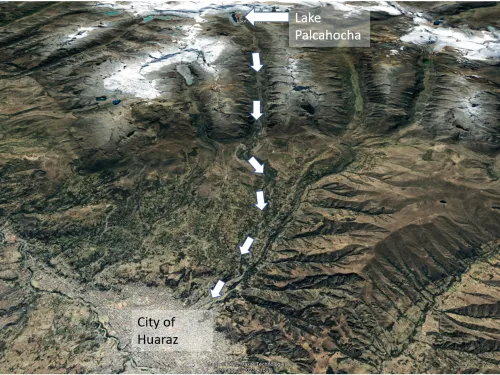 The Cordillera Blanca Mountain Range in Peru has been the location of the highest loss of life from GLOF events. In 1941, an ice avalanche triggered the failure of the moraine dam at Lake Palcahocha (elevation 15,000 feet). The flood killed an estimated 4,000 people in Huaraz, a third of its population at the time8.