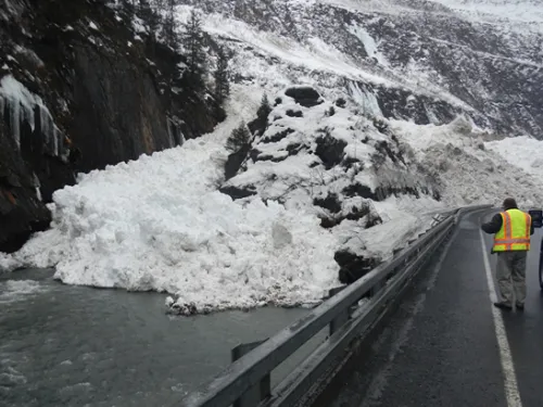 On January 24, 2014, after 12 inches of rain and warm temperatures, several avalanches occurred near Valdez, Alaska. The largest avalanche blocked Lowe River, forming a half-mile-long lake 30 feet deep. The avalanche blocked Valdez’s only road access to the rest of Alaska. It was dubbed by locals as a “Damalanche.” State DOT staff were mobilized from across the state to remove over 200,000 cubic yards of ice. Access was restored after 12 days.