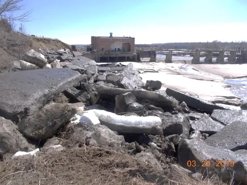 In March 2019, after a cold winter and a foot of snow, a bomb-cyclone event hit the Midwestern Plains of the U.S. Because of the high precipitation, snowmelt, and frozen ground conditions, the Niobrara River in northern Nebraska received substantial runoff. The 2-foot-thick river ice floated in the flood water, broke into large slabs, and floated downstream. Numerous ice jams occurred. One large ice jam formed upstream of Spencer Dam – an embankment dam with a concrete/powerplant spillway structure. The jam created a large body of water, and when it was released, Spencer Dam quickly overtopped and failed, causing the loss of one life.