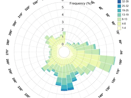 The necessary relationships can be developed by compiling and analyzing regional wind data from available monitoring stations to derive exceedance probability curves, which are used to estimate representative overland wind velocities. These frequency velocities would then be converted to over-water velocities using published guidance. In the U.S., gage data for a given site may be available from the National Oceanic and Atmospheric Administration’s (NOAA) National Centers for Environmental Information (NCEI) or other data providers. A fairly common and useful method to visualize windspeed, direction, and probability relationships is via wind rose diagrams, circular charts showing the frequency of wind direction and speed at a specific location such as a gaging station.